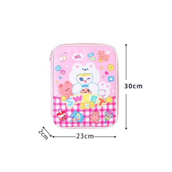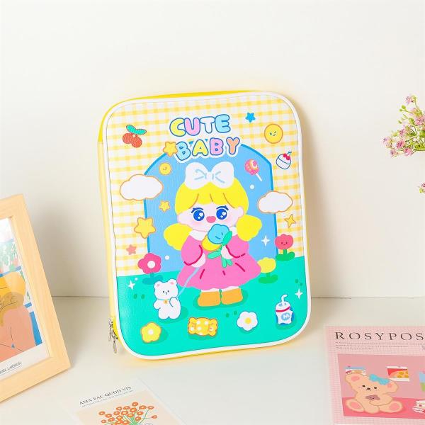 The case can fit up to an 11-inch tablet inside. It has a super cute kawaii cartoon-looking character on the cover, and it also offers storage for your stationeries.
